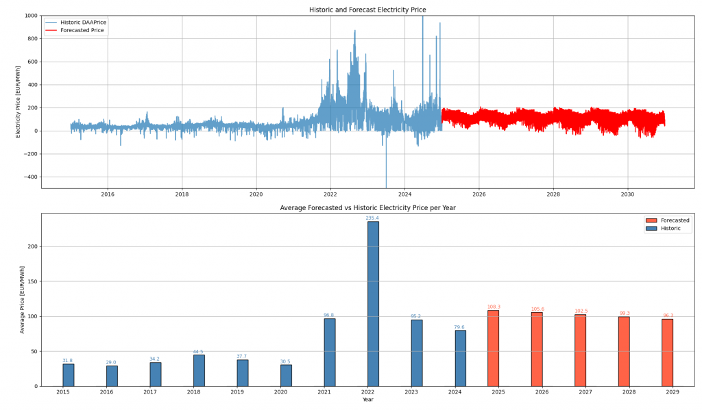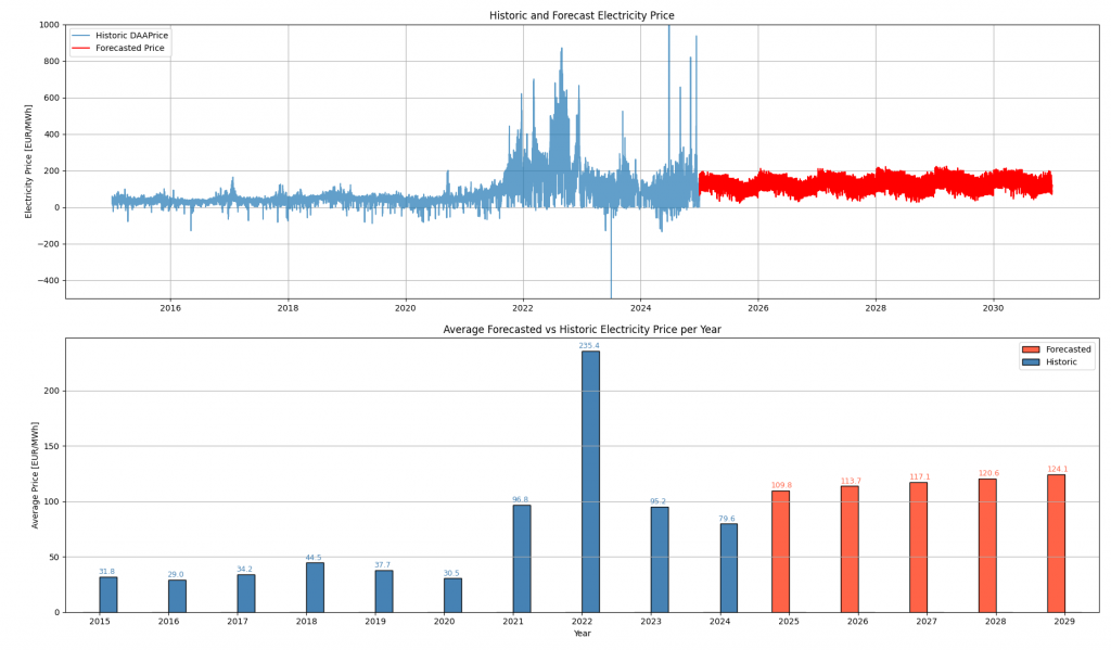 Introduction: Electricity price forecasting plays a critical role in strategic planning and decision-making. In this post, I explore the use of the SARIMAX (Seasonal AutoRegressive Integrated Moving Average with eXogenous regressors) model to project electricity prices from 2025 to 2030. I leverage historical data from 2015 to 2024 and incorporating key external factors such as CO₂ prices, gas prices, load forecasts, and electricity generation from PV. This simple model captures both seasonal patterns and external influences to provide basic forward-looking insights.