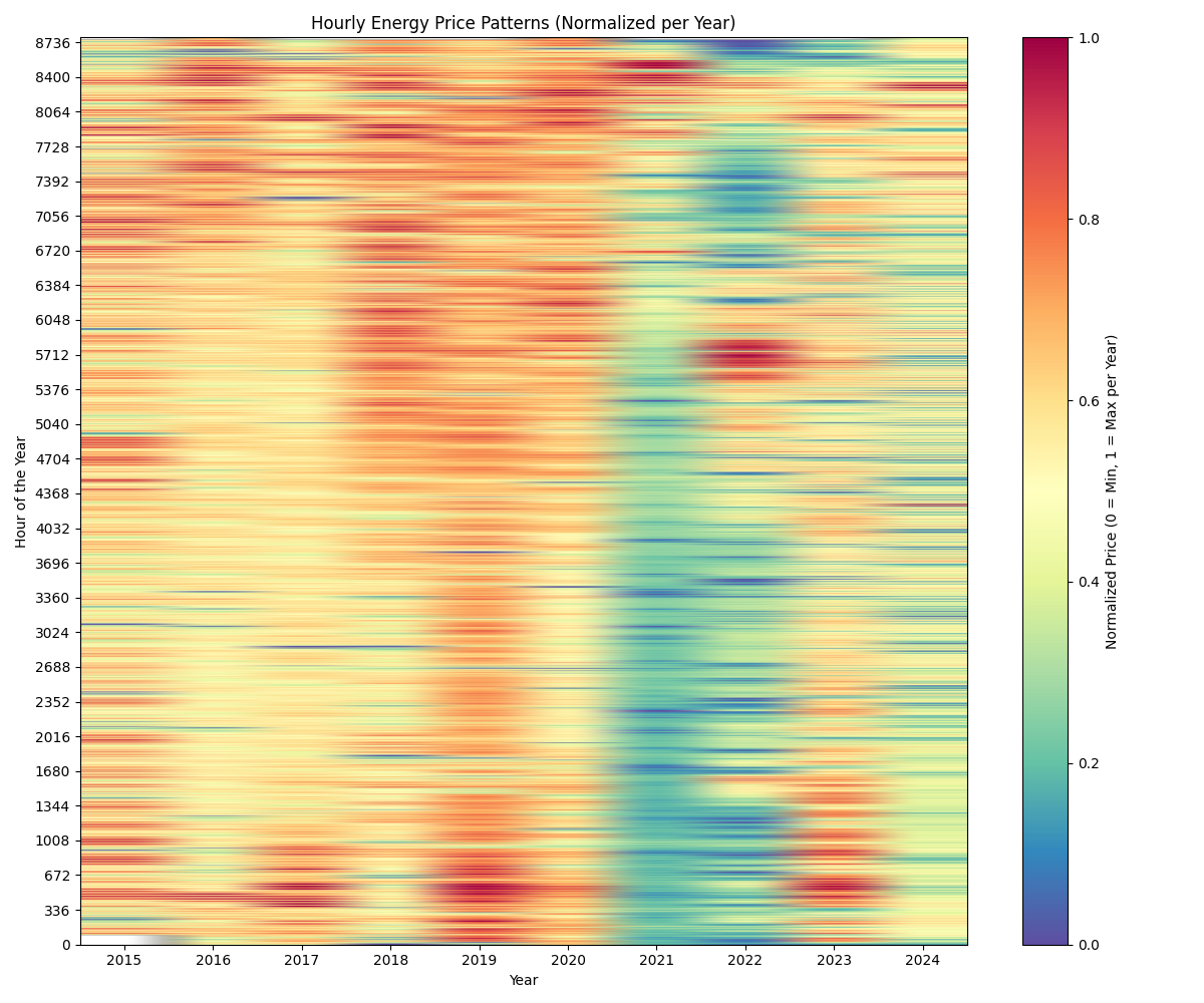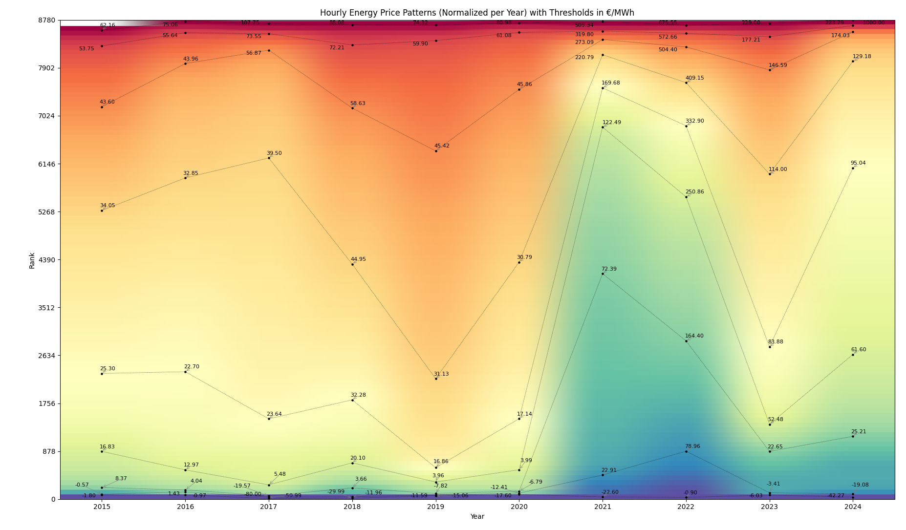 It is visible, that some values in 2015 are missing (the white top left corner). Other than that one can see, that the share of blue and green values is rising over the years. This means, that lower prices are becoming more common, while the prices in the medium range are getting fewer. Since we normalised the values, however, this graph does not show the absolute values of the energy prices. The few relatively high prices could be rising in absolute terms, thus meaning that energy producers can make the same revenue in in less hours of the year. To make this a little bit more visible we identify the prices which correspond to a certain normalised price in a year, e.g. 0.1, 0.2 and so on.