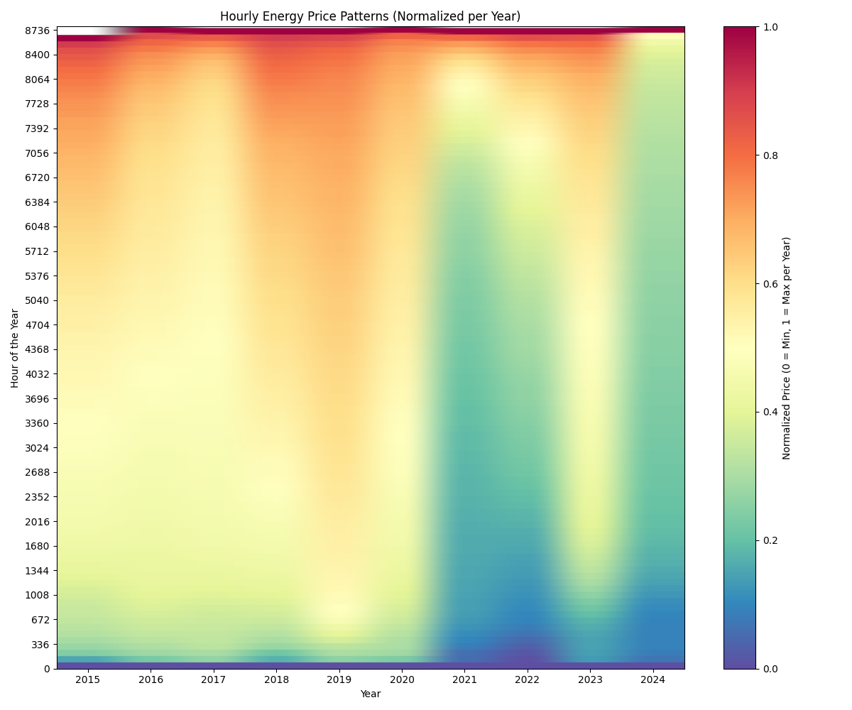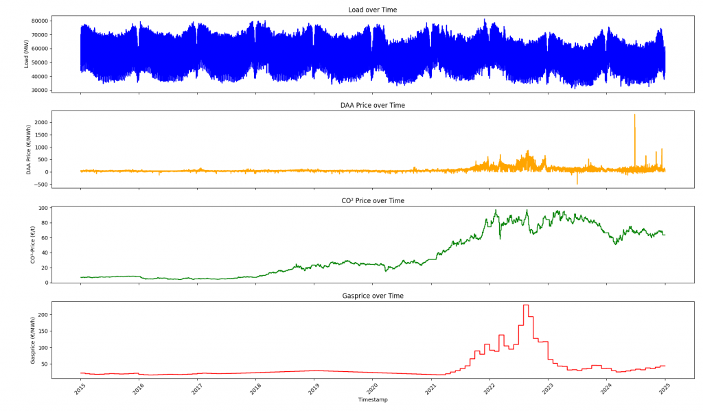 Preprocessing involved checking the data for missing values and resampling it to an hourly resolution covering the years 2015-2024. Using Pandas, timestamps and indices were standardised and aligned.