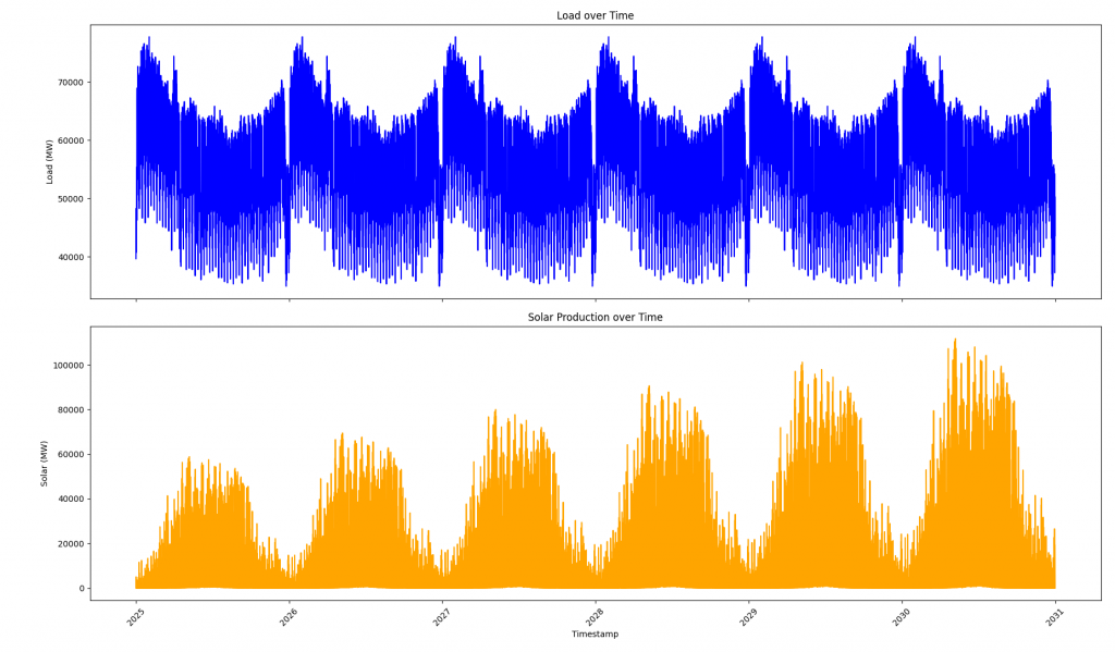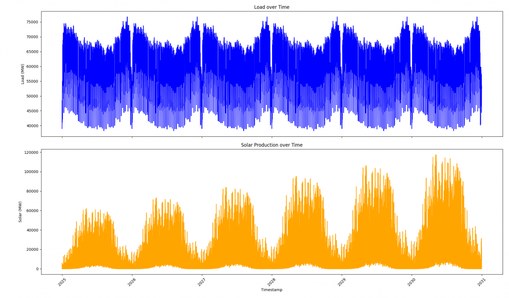 Regarding the electricity demand/load and the solar production we get two timelines for the forecasted time period. With an 8-hour resolution, the graphs look like this: