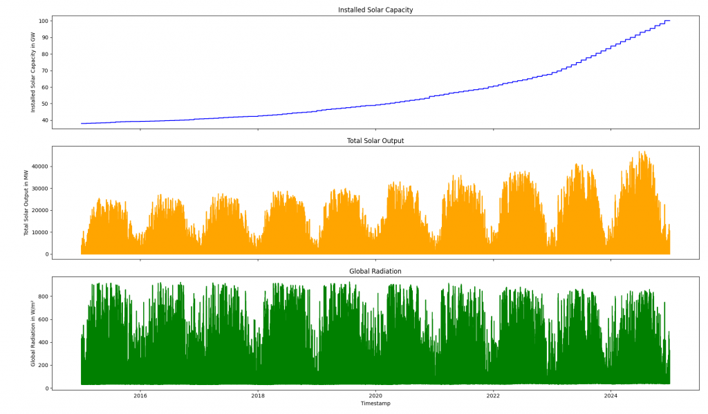 The second graph shows the installed solar capacity and the total solar output. Additionally, it shows the measured Global Radiation. It is visible, that with the rise of additional solar capacity, solar output rises. At the same time, the global radiation stays roughly the same, with some differences between the years.